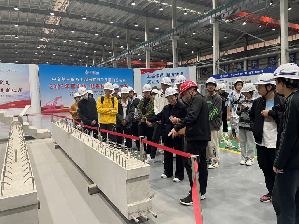 在中交第三航务工程局有限公司厦门分公司,项目负责人介绍了沉箱、叠合板、管片、导管架等结构的预制工艺。师生们与现场技术人员就施工工序、构件运输等问题进行了深入交流。