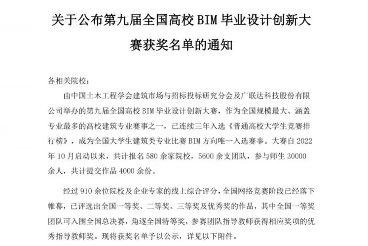 “全国高校BIM毕业设计创新大赛”连续三年入选全国普通高校学科竞赛排行榜。大赛自2022年10月启动以来,共有来自全国584家院校报名,5682支团队参赛,共计提交作品4194份,参与师生30000余人,本次大赛已经成为各高校和建筑业界久负盛名的赛事,具有较强的社会影响力。