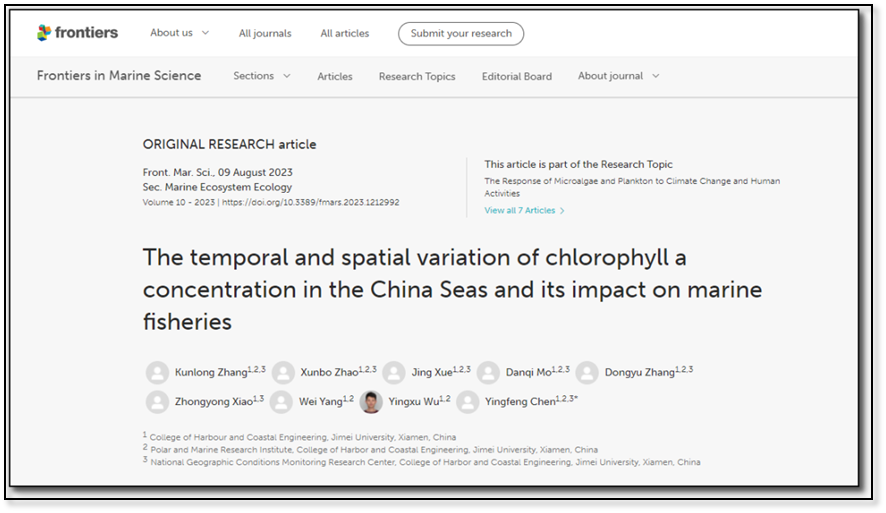 近日,港口与海岸工程学院地理信息科学专业2020级本科生张坤龙以第一作者,指导老师陈颖锋为通讯作者,在SCI期刊Frontiers in Marine Science(中科院海洋与淡水生物学1区,JCR Q1,IF=3.7)发表题为“The temporal and spatial variation of chlorophyll a concentration in the China Seas and its impact on marine fisheries”的研究论文。这是我院在校本科生首次以第一作者身份在SCI一区刊物上发表论文,实现了重大突破,我院本科生培养质量获得进一步提升。