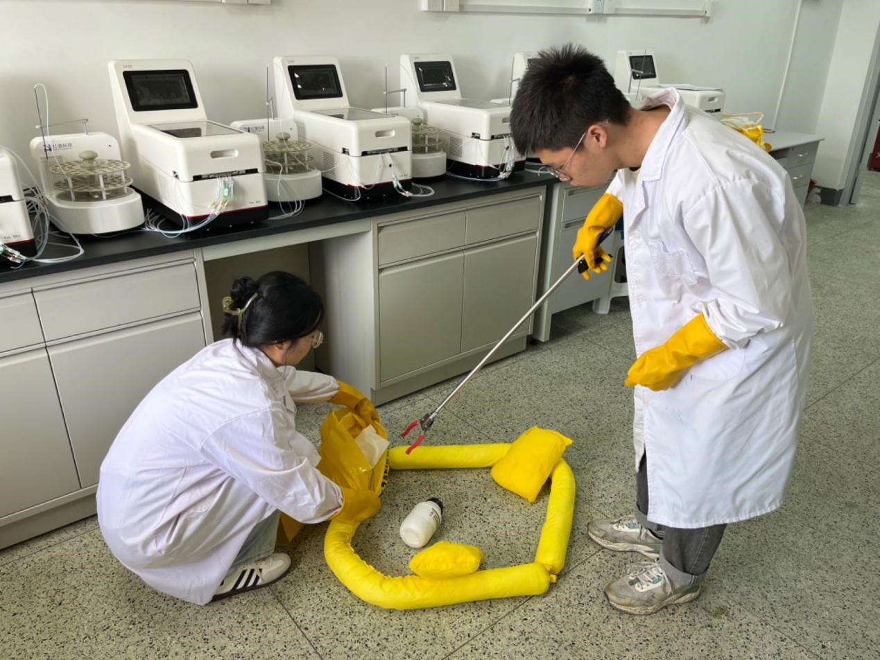 紧接着在集诚A海岸带环境综合检测室开展突发环境事件(危废泄漏)应急演练。内容包括泄漏应急套件内器材的使用介绍、老师和学生参与自救演练、实验室安全事故应急响应、实验室安全事故应急处置、事故现场应急恢复和事故分析整改等。