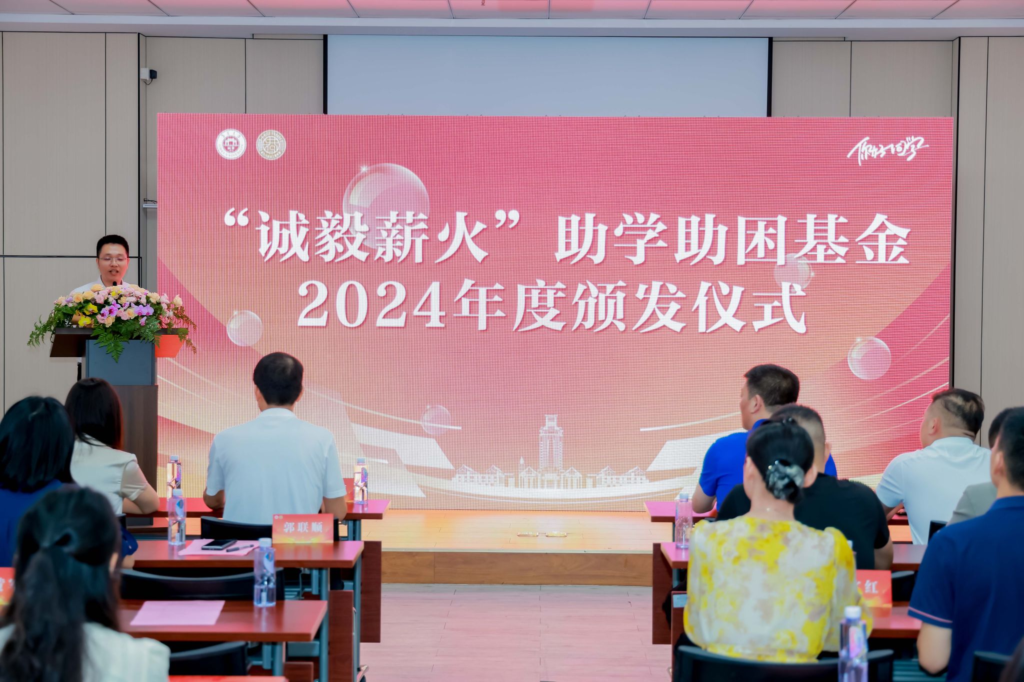 “诚毅薪火”助学助困基金的发起人和捐赠人陈云南的代表赵立先生致辞。他指出:“诚毅薪火”助学助困基金在于弘扬嘉庚精神、秉承‘诚毅’校训、达到‘薪火’相传的公益目的。这份助学基金不仅仅是经济上的支持,更是一份沉甸甸的责任与期望。他强调:希望受资助学生牢记基金成立的初心,诚毅待人,毅以处事,始终保持一颗感恩的心,并将这份爱心一直传递下去!
