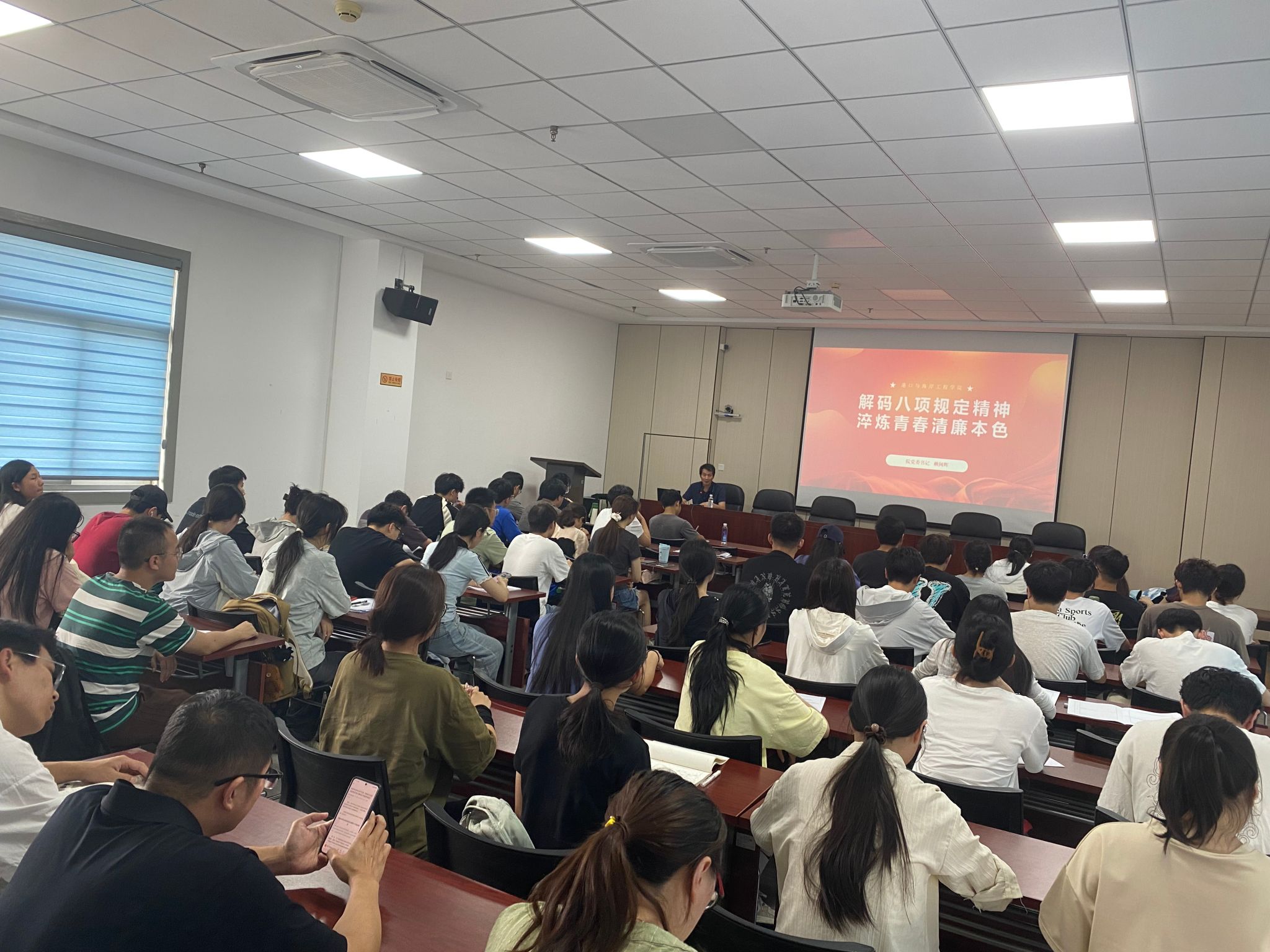 赖闽辉从诞生背景、内涵辨析、精神内核、时代回响四个维度,结合详实资料与鲜活案例,系统解读中央八项规定精神,让同学们全面了解其历史脉络、深刻内涵与实践成效。他还结合青年学生成长实际,以认知偏差、学术失范、消费异化等典型案例敲响警钟,强调廉洁是青年学生塑造正确价值观的“必修课程”,“廉洁素养”是求职就业、立足社会的核心竞争力。他要求,青年学生要强化思想建设,筑牢道德堤坝;要严格自我约束,遵守校规校纪;要践行清廉准则,以学术诚信立身、以勤俭节约为本、以服务奉献为先。
