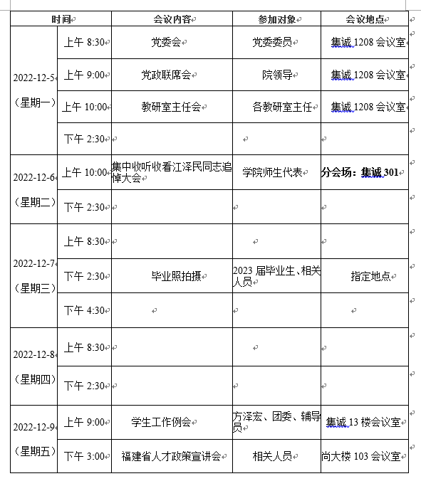第十五周会议安排表