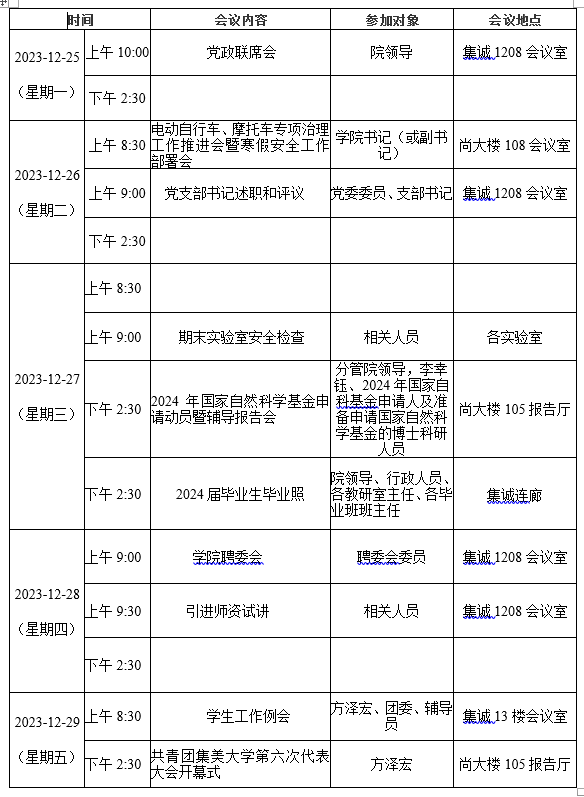 第十七周会议安排表