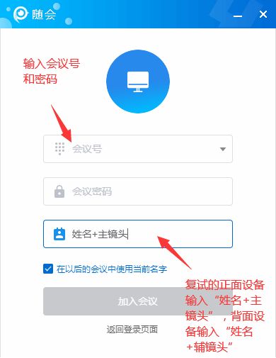 (2)在设备上打开随会,按以下说明操作填写相应信息,然后点击“加入会议”,进入等候室,等待复试秘书操作;